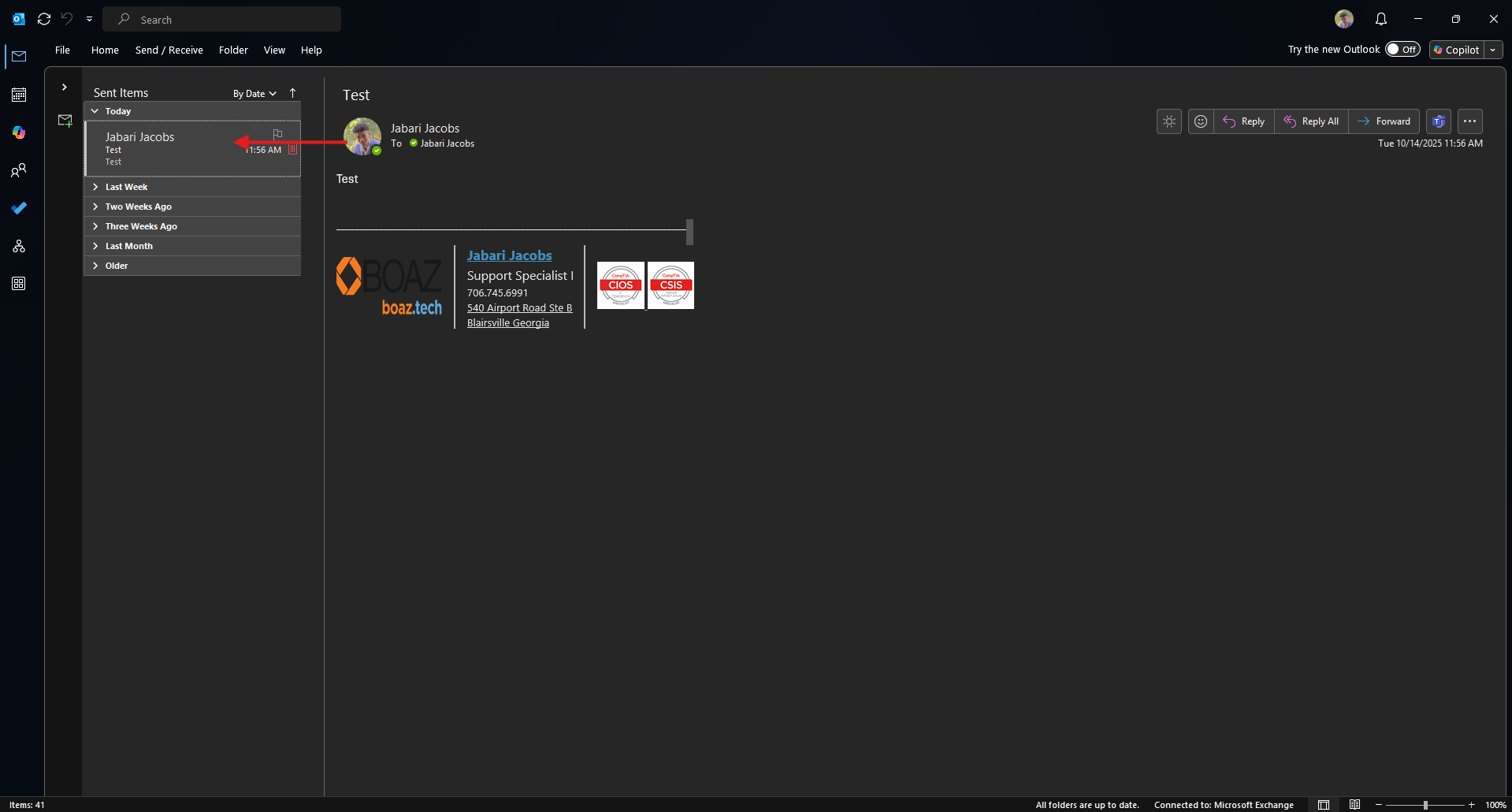 Your email will appear as a new page, showing the subject, sender, recipient, date, and message content.