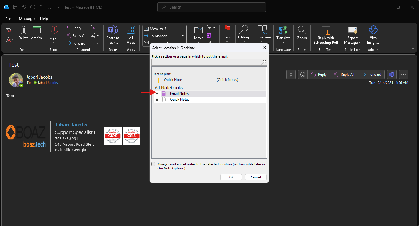 You’ve now created a dedicated Email Notes notebook in OneNote and configured Outlook to send messages directly into it.