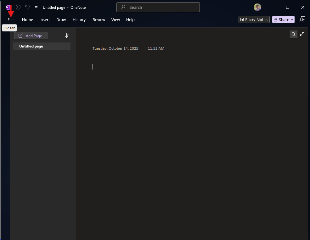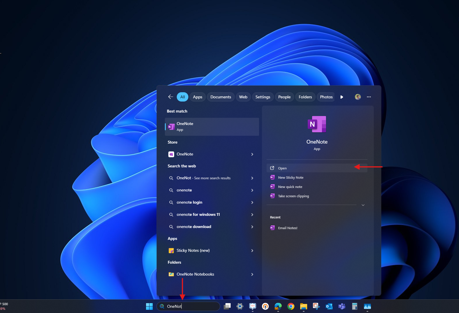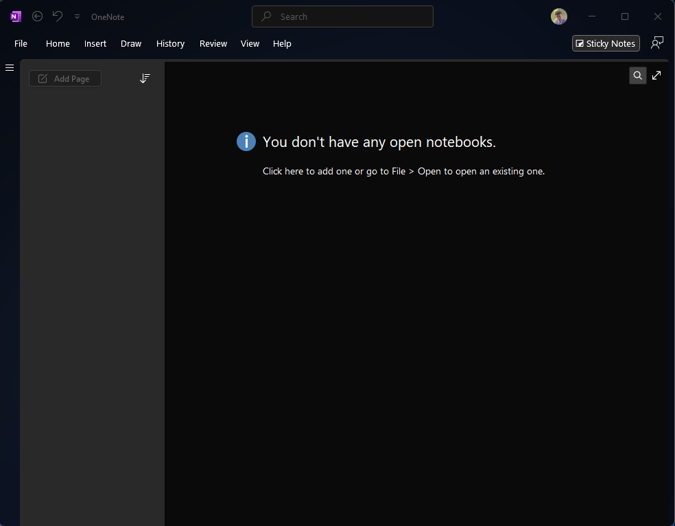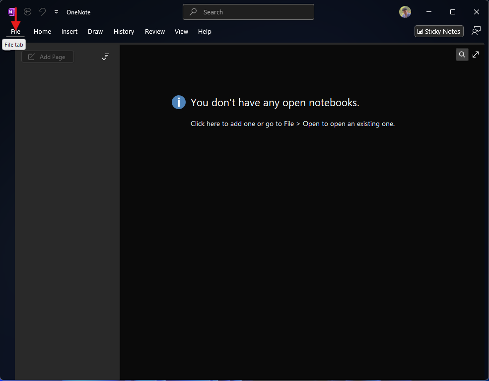 When OneNote opens, you may see a message stating “You don’t have any open notebooks.”