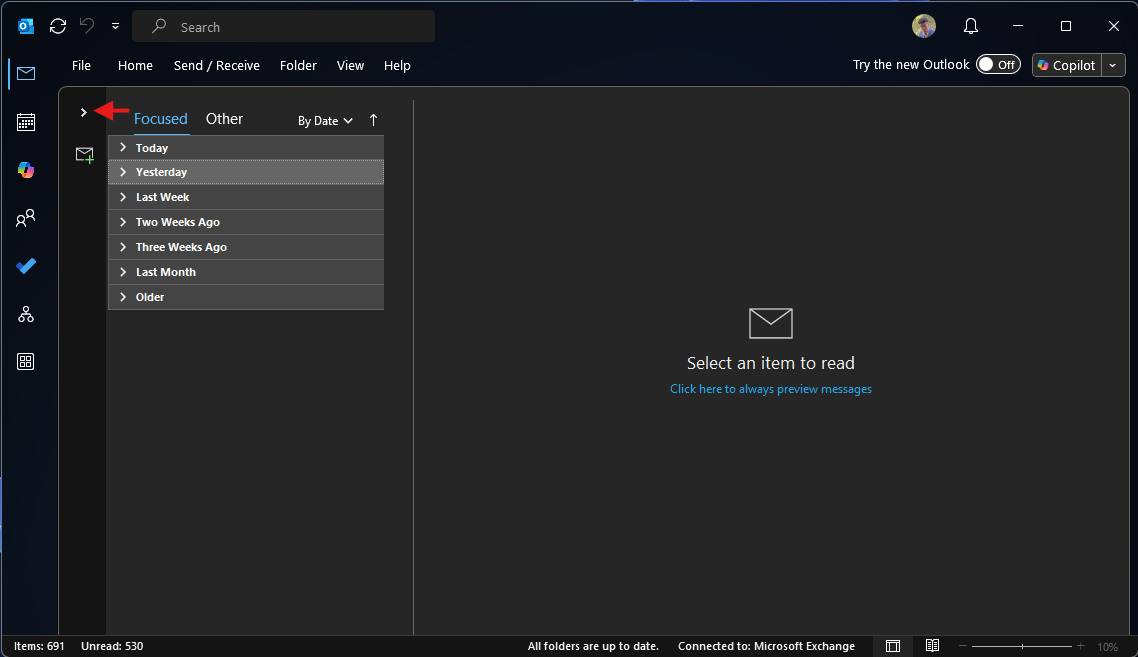 Open your mailbox folder pane by clicking the arrow under the "File" tab.