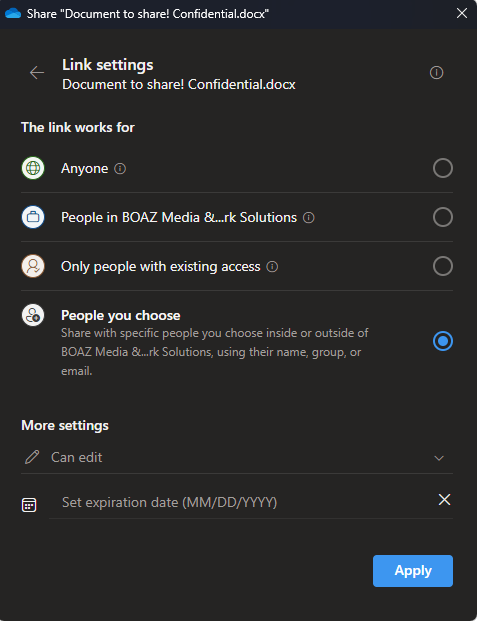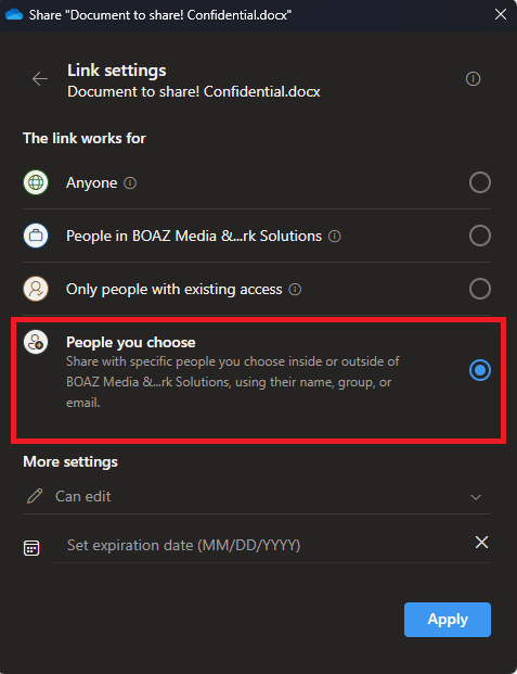 🔒 Best practice: Use People You Choose (Specific people) whenever possible.